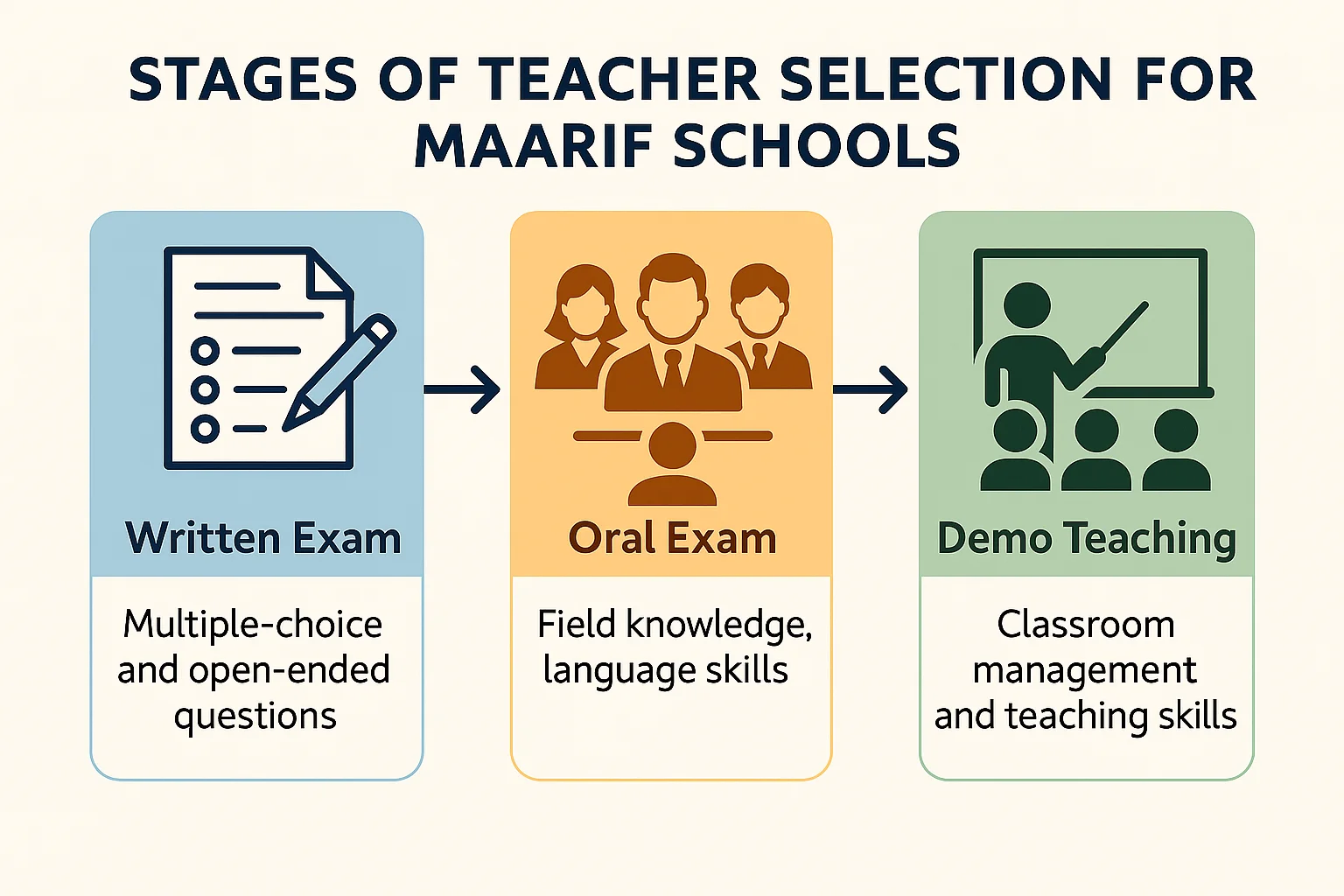 In order to be a teacher in Maarif Schools, people who have the qualifications in the advertisement given by the Turkish Maarif Foundation apply for the advertisement. Candidates who meet the application requirements are invited to take the written exam consisting of multiple choice and open-ended questions. Candidates who are successful in the exam; It is subjected to a three-stage oral exam in which the knowledge of the field, whether the managerial abilities are carried or not and whether the language skills are sufficient or not. Candidates who successfully pass the written and oral exams are employed as teachers or administrators in Maarif Schools.